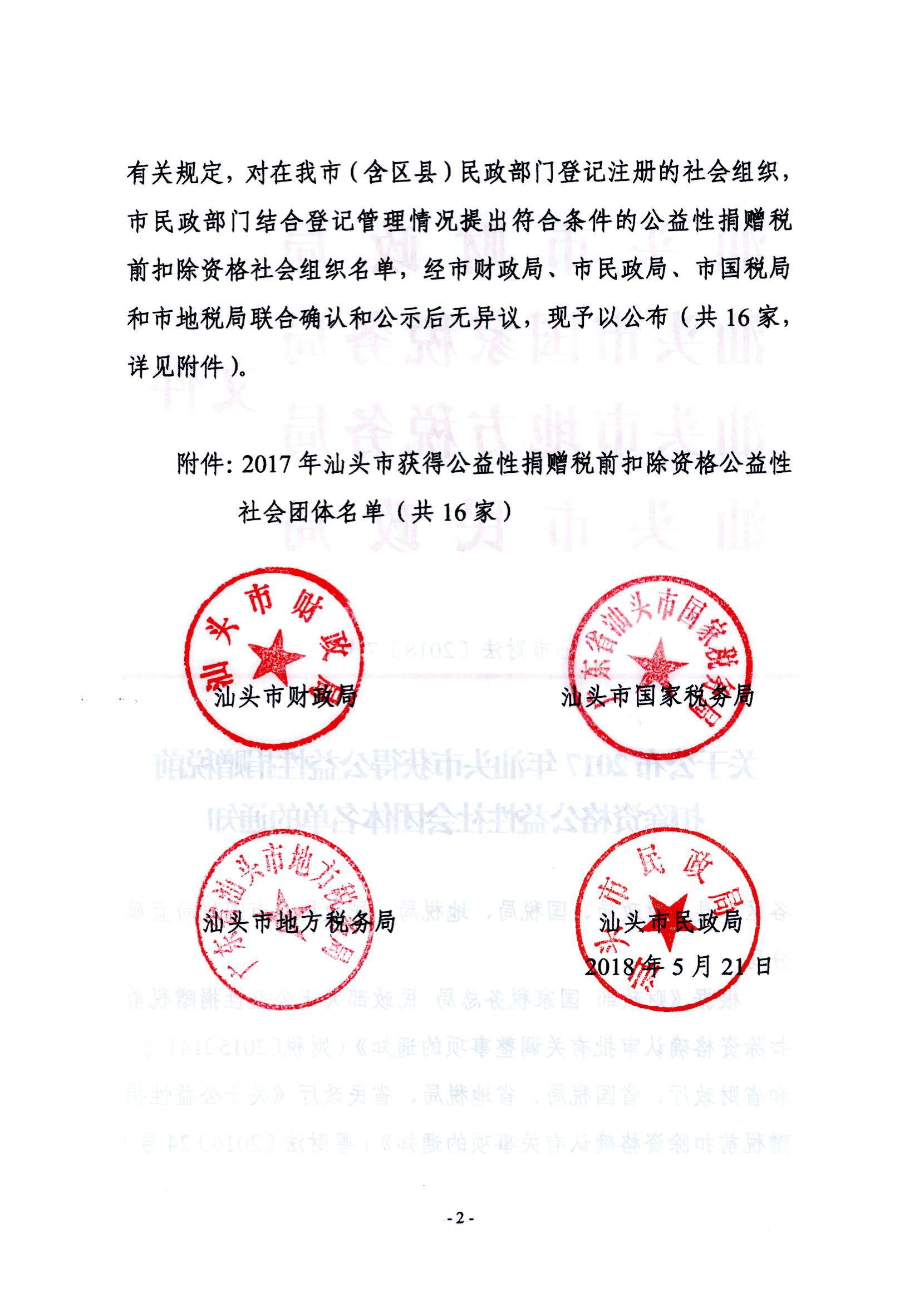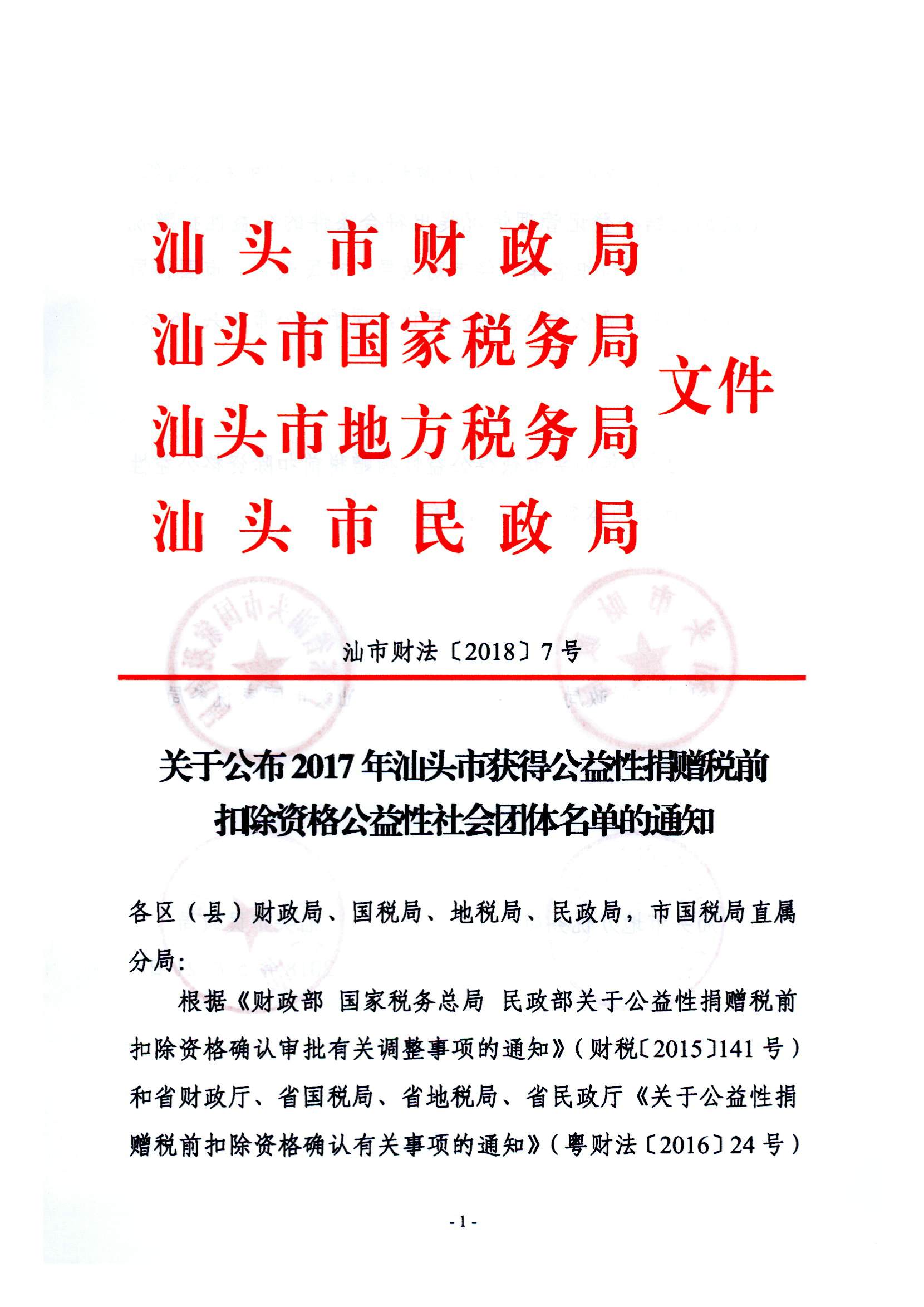 关于公布2017年汕头市获得公益性捐赠税前扣除资格公益性社会团体名单的通知