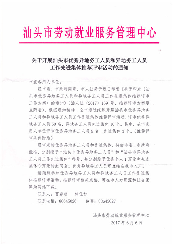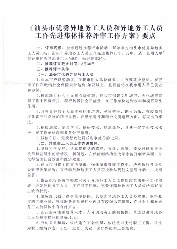 关于开展汕头市优秀异地务工人员和异地务工人员工作先进集体推荐评审活动的通知