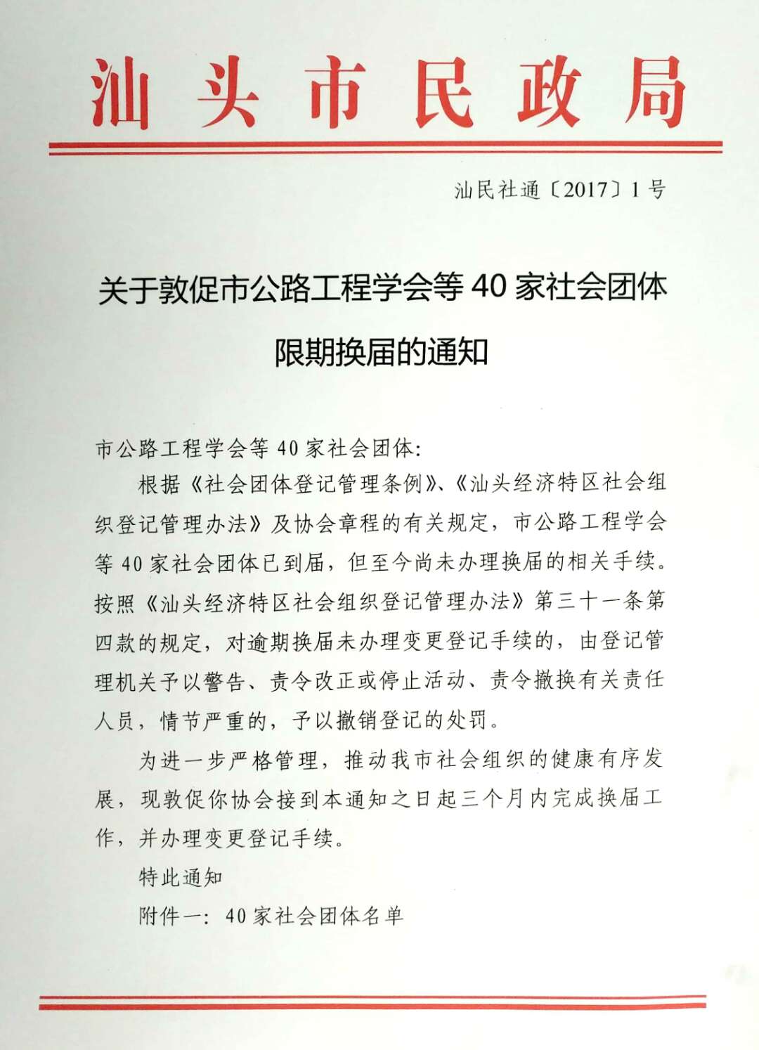 关于敦促市公路工程学会等40家社会团体限期换届的通知