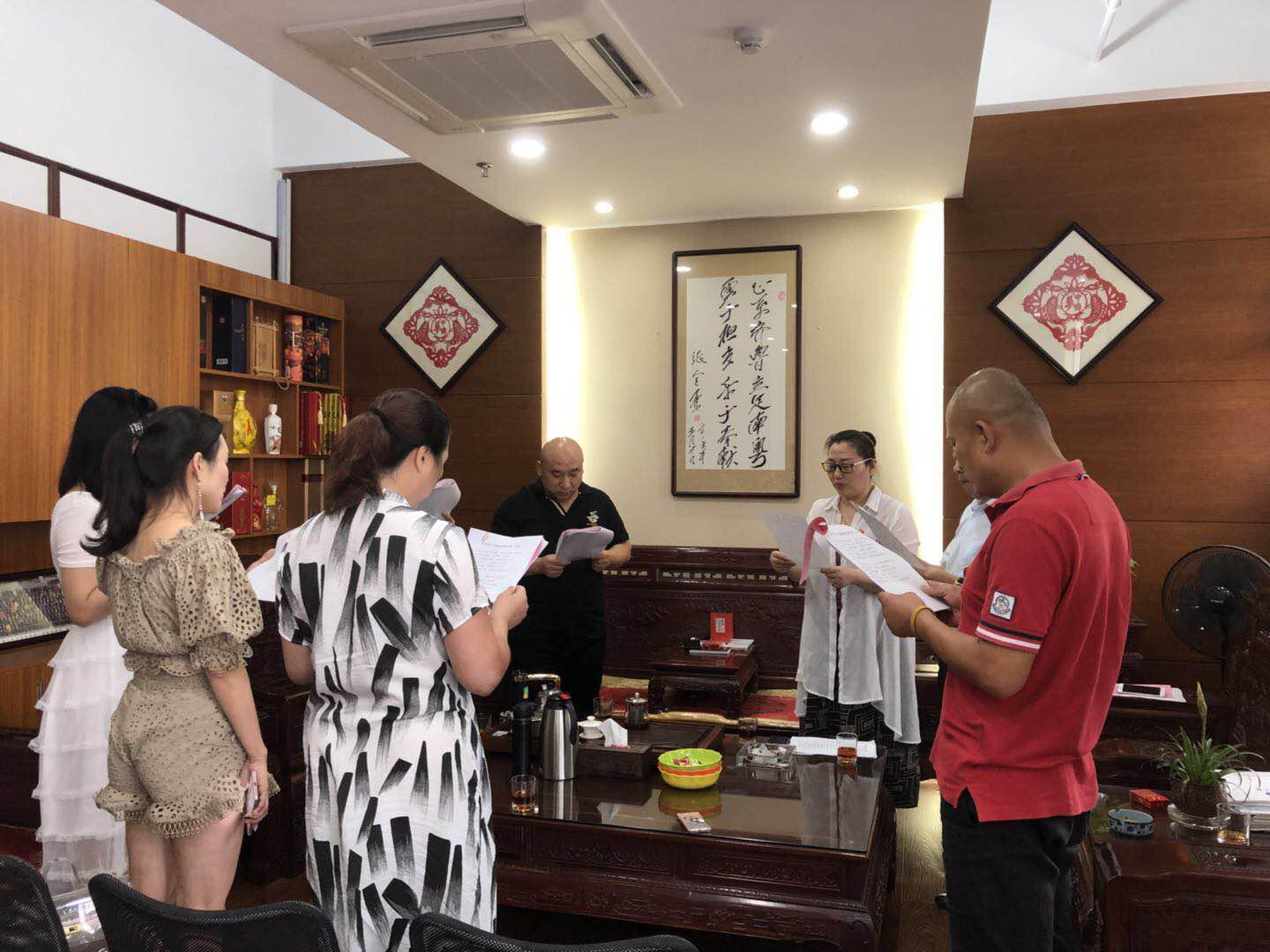 会议由党支部书记王穗主持召开,汕头市山东商会孙健会长,党支部党员、流动党员及入党积极分子都积极参加了此次“七一”建党节主题活动会议。主要内容如下:1、组织学习“七一”建党节的由来;2、学习习近平总书记铭记历史缅怀先烈,开展重温革命历史、传承红色基因等内容的主题活动学习,围绕“锤炼党性当先锋”开展党员学习讨论;3、纪念“七一”建党节诗歌朗诵两篇《七月的天空》《党之诞生》;4、全体歌唱《没有共产党就没有新中国》;5、组织全体党员向党旗宣誓,重温入党誓词。